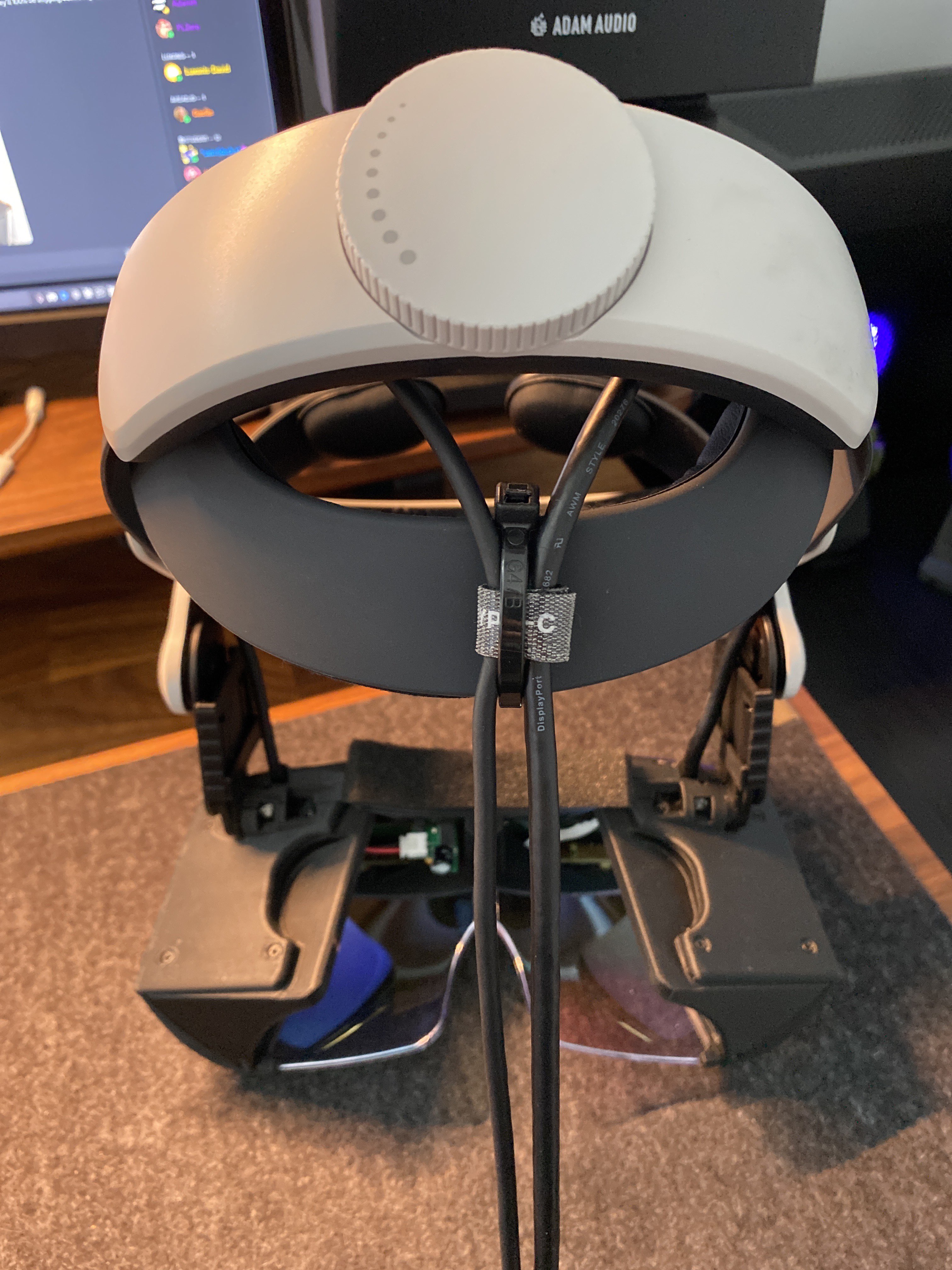 BoboVR Deck X with Bollé Welding Headgear Deck X in the background on an original calibration stand, and a cable view of the BoboVR with Velcro & zip tie solution